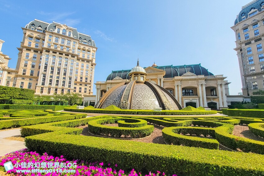 花園中央有一個巨型圓頂,周圍還有綠草設置的迷宮非常有趣,在藍天白雲的映照下不說真的很像置身在歐洲的氛圍,可以趁早上或傍晚時來這裡走走拍照,傍晚夕陽跟夜晚打燈時的夜景都很美。