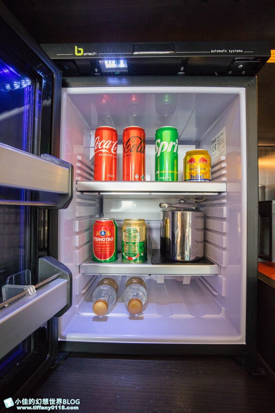 mini吧的小冰箱裡放滿汽水、飲料跟啤酒,都是可以免費喝的,連瓶裝水也給了好幾瓶超棒。(喝酒不開車,未滿18歲請勿喝酒)