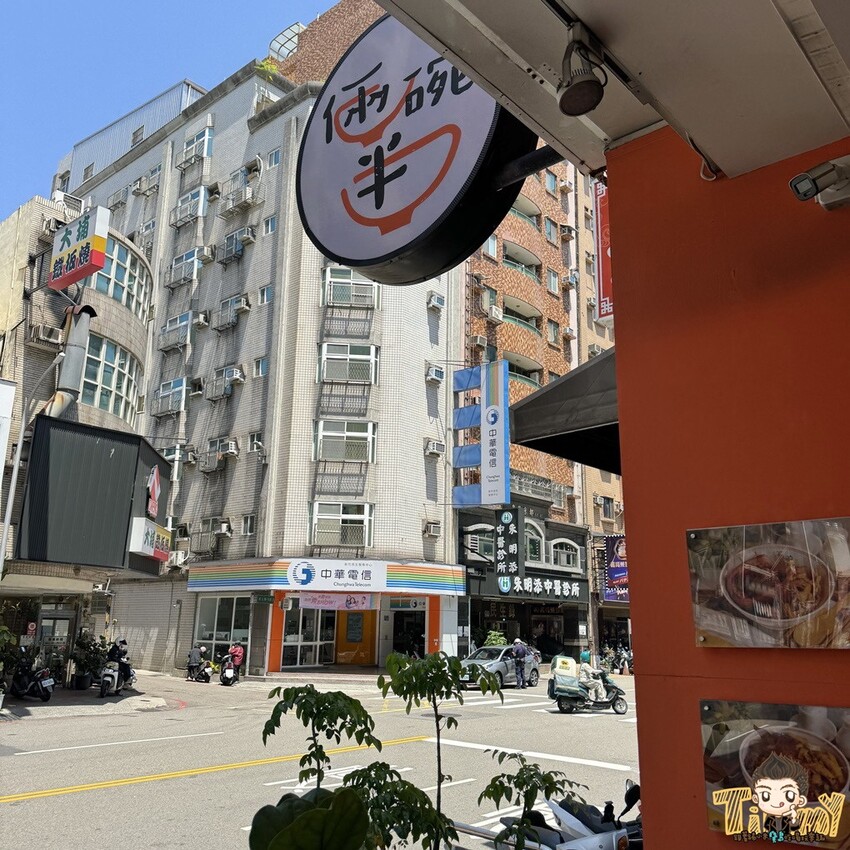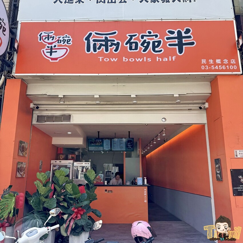 倆碗半位於民生路上,中華電信對面,橘色招牌挺吸睛的