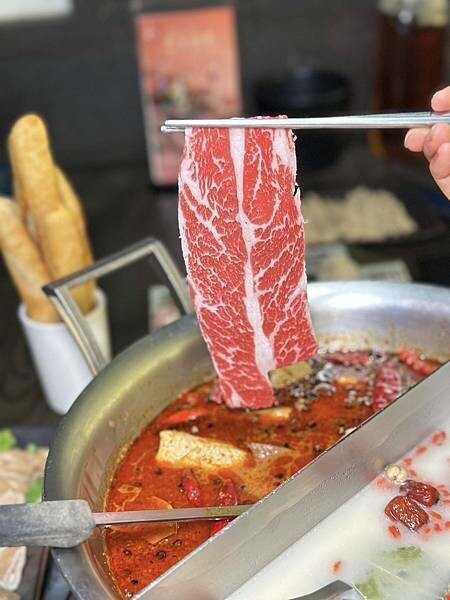 ▼夾起一片油花細緻均勻的無骨牛小排涮鍋,
