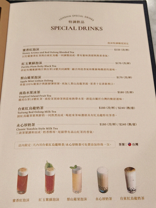 整本的菜單有圖片參考和簡短文字說明,看起來更加清楚,第一頁是特調飲品,以泡沫紅茶和奶茶為主,價位$150~240