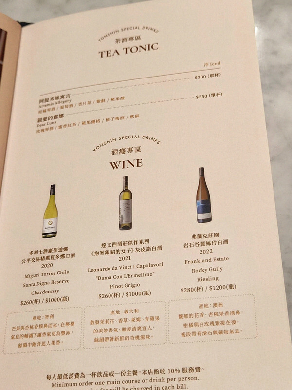 這張永心鳳茶勤美誠品店的菜單主要是茶飲和甜點,除了茶飲也有提供特調和酒精性飲料,甜點包括千層蛋糕,奶酪捲和鳳梨酥,選擇性還挺多的