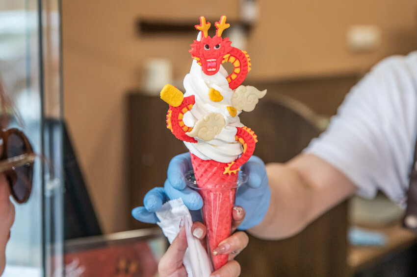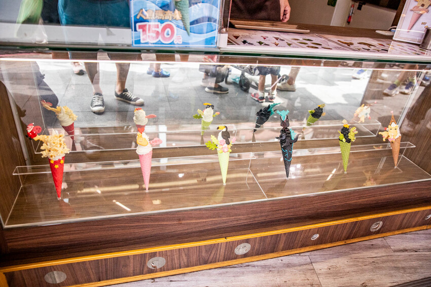 我們買了兩支霜淇淋,最夯的怪獸的逆襲跟龍年限定新品祥龍造型霜淇淋,霜淇淋不大支,但造型真的非常浮誇好拍,冰淇淋甜筒也是自家生產的,霜淇淋下面也有透明的甜筒杯,因為大家買了都會拍照錄影,拍完冰也在溶了,有保護比較不會弄髒手