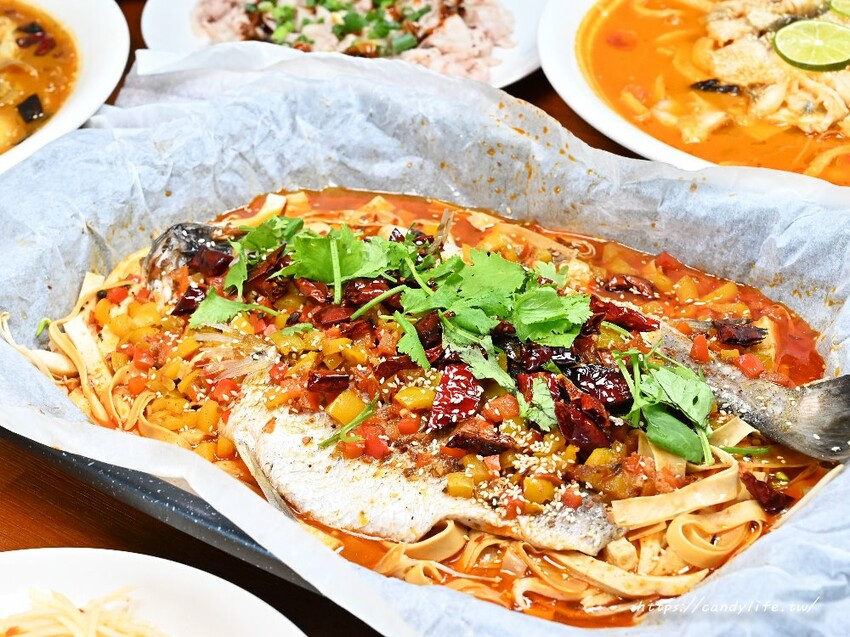 這道麻辣紙包魚也很厲害,有別於剛剛的酸菜魚、水煮魚及番茄魚,上桌時是一整隻完整的新鮮鱸魚,配料一樣有百頁豆腐、豆皮、馬鈴薯、黑木耳、豆芽菜及白精靈,搭配辛香料下去悶煮,香氣十足,肉質真的是嫩到不行,這道麻辣紙包魚糖糖也超推