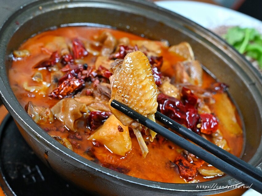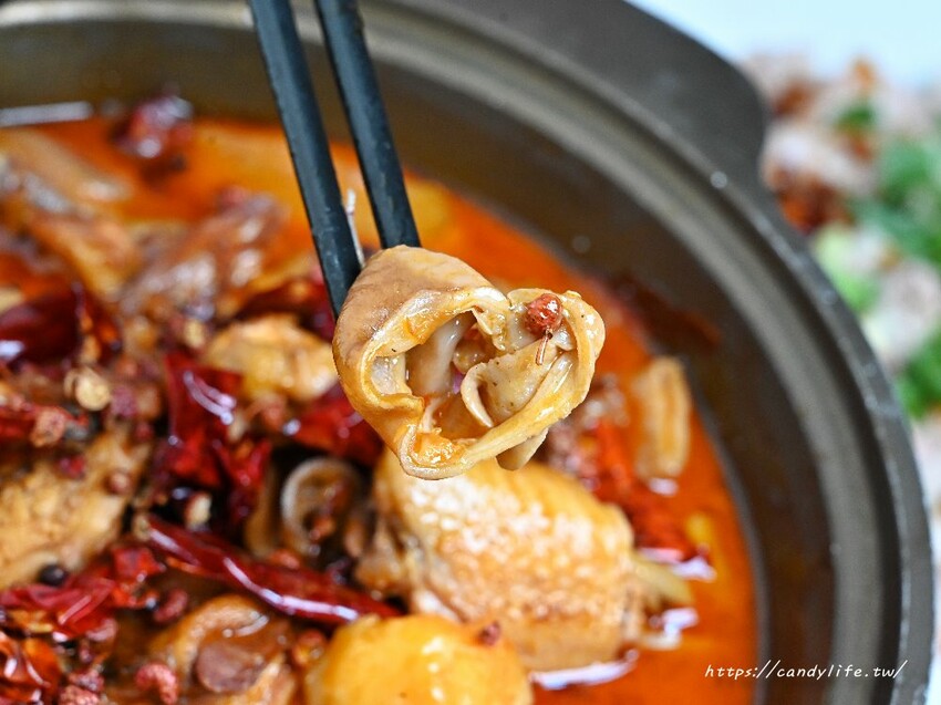 這道麻辣肥腸雞,如果本身不太吃辣的朋友要做好心理準備,因為吃了可能會噴火!這辣度對糖糖來說應該有中辣以上了,雖然很辣但很好吃,裡頭的雞肉是採用溫體雞,將雞肉剁成塊狀後加入辛香料下去燉煮40分鐘,搭配肥腸及馬鈴薯,不僅燉煮入味,肉質也相當軟嫩,裡頭的肥腸也好好吃,口感Q軟無腥味