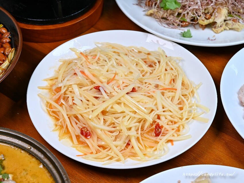 糖糖最愛的酸辣土豆絲,在贏到鮮水煮魚螺螄粉海南美食私房菜也吃的到,採用整顆馬鈴薯手工切成絲狀,而不是用刨刀,拌入特製酸辣醬,口感爽脆鮮甜,辣度約小辣至中辣,會讓人越吃越涮嘴