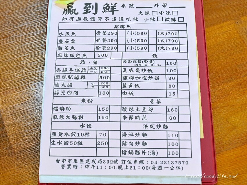 贏到鮮水煮魚螺螄粉海南美食私房菜位在台中東區建成路靠近東光路,距離樂成宮不遠,紅色扛棒相當顯眼,去年10月開幕至今一直深受在地人的喜愛,擁有好口碑也吸引了不少外地客前來用餐