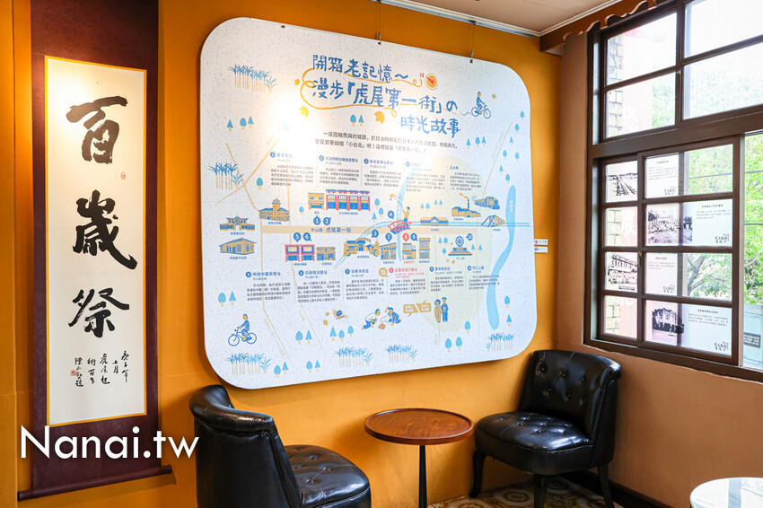抬頭一看日光穿過復古窗戶撒落在懷舊空間裡,彷彿時間也緩慢下來,而我們聆聽著虎尾起街百歲祭故事,據說是由民間集資,為虎尾舉辦的百歲祭,當年活動辦得十分熱鬧,甚至虎珍堂還推出天長餅,如同日本天皇與皇后感情天長地久也代表著祝福。