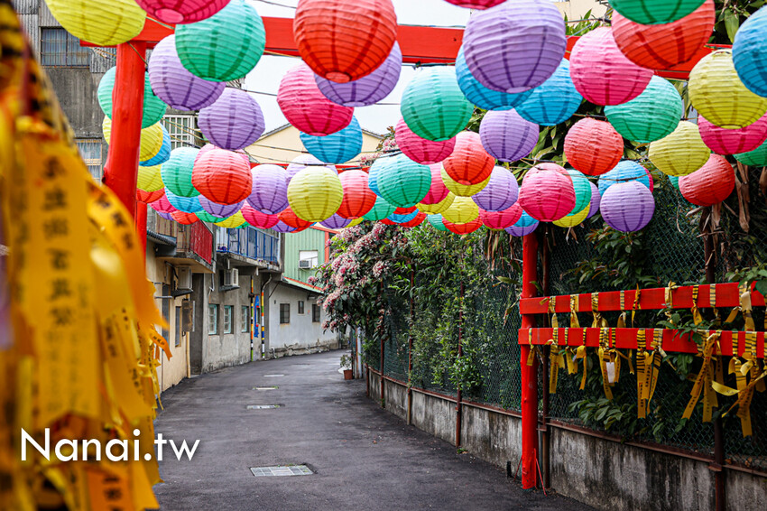 天啊~這也太可愛了吧,紅色鳥居掛上整排彩色燈籠,拍照唯美又好看,據說是「虎珍堂」復刻鳥居緬懷神社與安慶圳,讓旅人來到這裡感受濃濃懷舊人文風情。