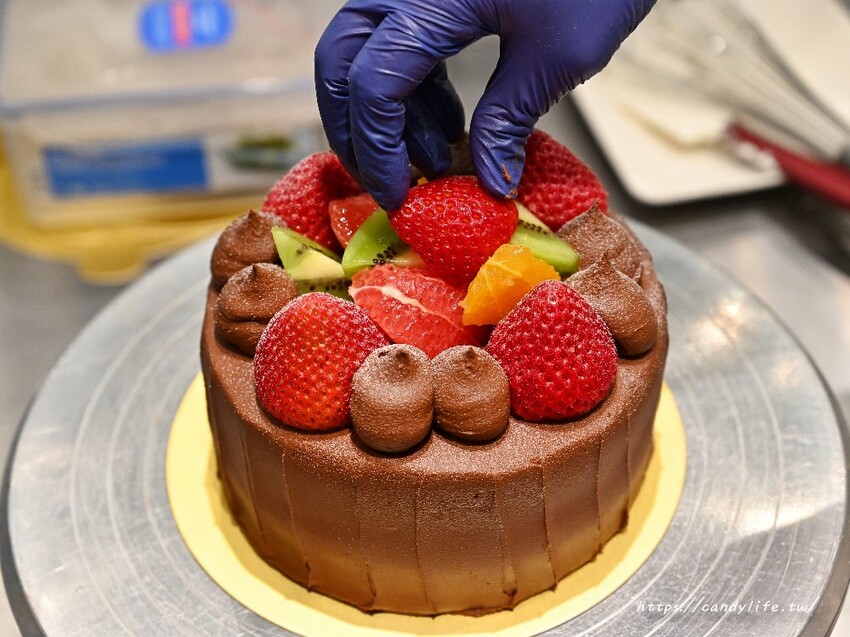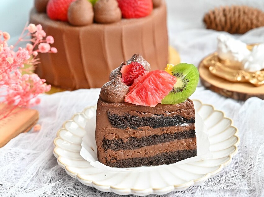 另一款蛋糕糖糖選了巧克力系列的濃情,以巧克力海綿蛋糕為基底,不只中間夾層巧克力甘納許,就連蛋糕外圍也抹上濃郁的巧克力甘納許,搭配綜合新鮮水果裝飾