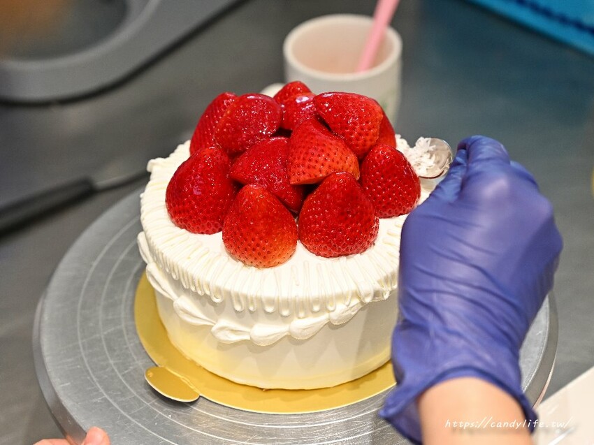 Pinede彼內朵台中旗艦店還有一大特色就是店內還有設置一大片的透明櫥窗,可以清楚看到甜點師傅們製作蛋糕的過程,畫面超療癒,這顆慶祝可是Pinede彼內朵的人氣招牌草莓鮮奶油蛋糕,使用北海道鮮奶油,搭配大量新鮮草莓,光是製作過程就讓糖糖好想咬一口