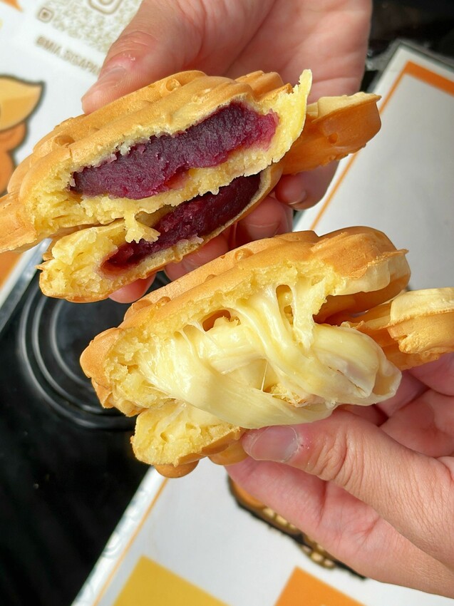 兩種口味料的給得很足,每一口都吃得到料,但這家雞蛋糕有一個小缺點,就是有別於台灣雞蛋糕是兩面酥脆,這一家是一面酥脆而已喔~