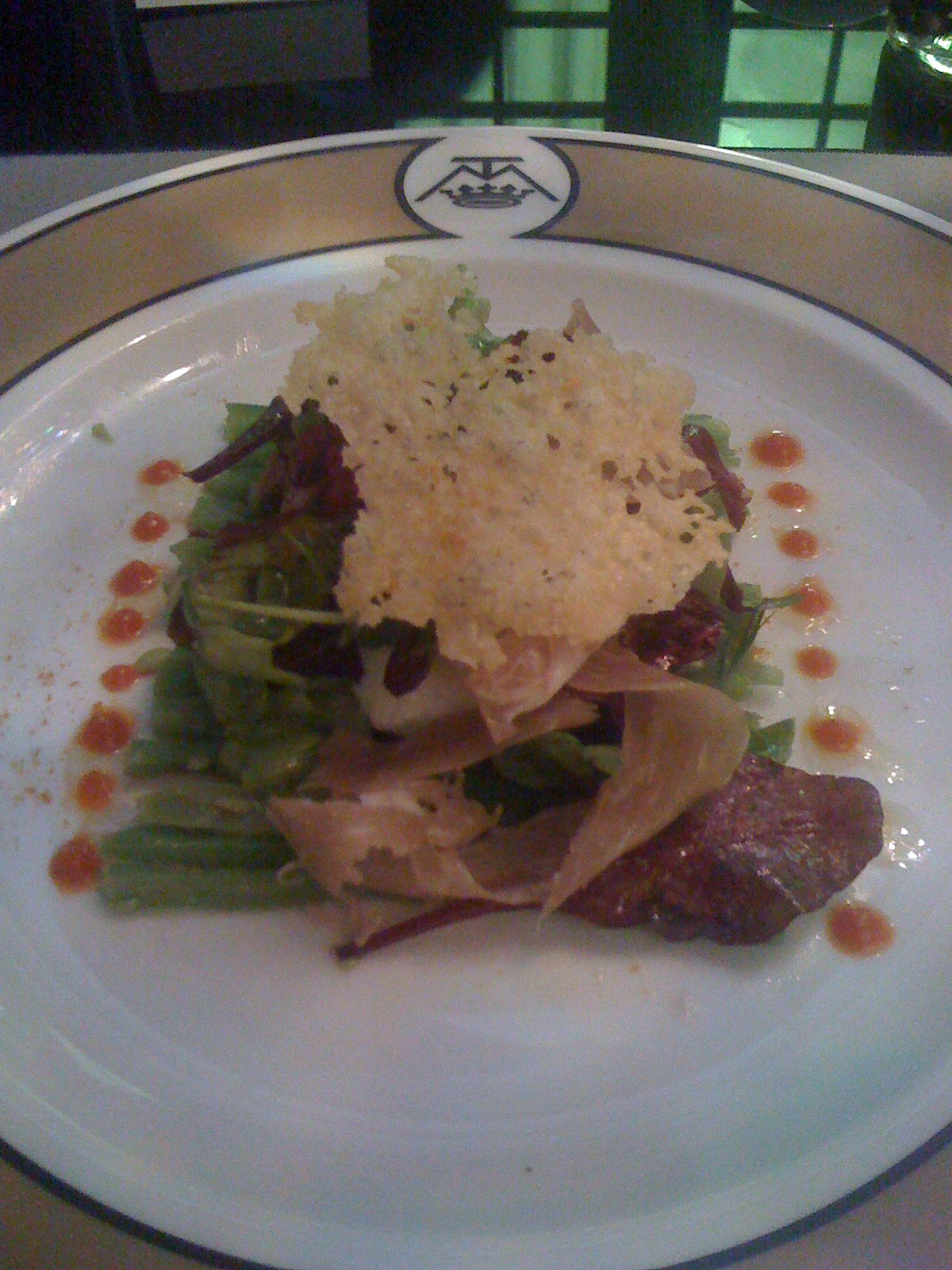 最上端的是起司脆餅 裏頭有水波蛋 帕瑪森火腿 生菜 最底層的四季豆