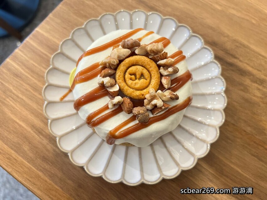 焦糖脆旁再以堅果圍繞著並淋上焦糖淋醬