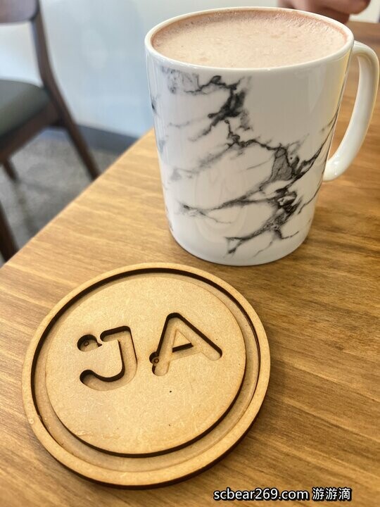 杯子下是有著店家名字的木質杯墊,也很有質感