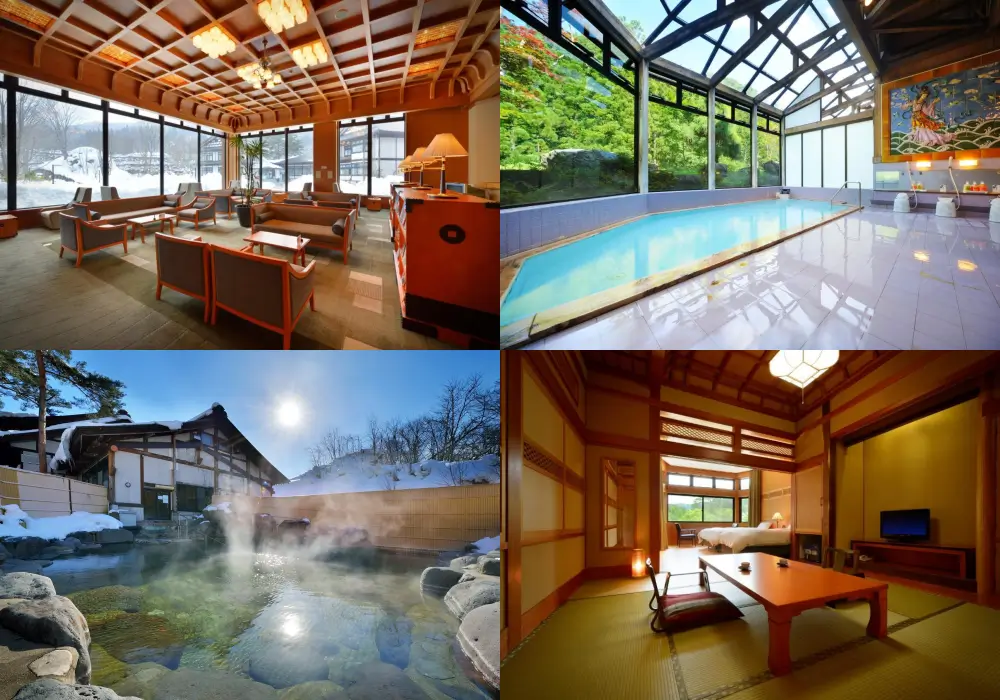 - - 這間住宿的外觀是日式傳統的大型別墅,特色是造景幽美的戶外溫泉,夜晚泡湯更加美麗浪漫,大型露天浴池的旁邊就能欣賞溪流。每一間客房都以沈穩的木質調為裝飾,並設有一整面的窗戶,可以近距離觀賞壯觀山脈景色,其中豪華日式客房最為熱門,地板設有榻榻米,可以體驗花卷傳統日式文化。
