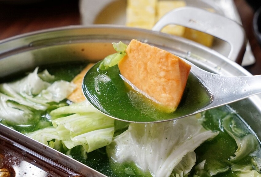 湯頭會如此翠綠是因為加入地瓜葉汁唷!喝起來很順口且菜味不厚重,真的是只吃外食的我們補充最佳的高纖蔬菜鍋。這高纖蔬菜鍋搭上麻辣鍋真的很讚,一辣一不辣吃起來更好味。