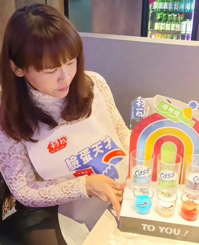 三杯不同顏色的飲料代表三種不同口味,可選含酒精,也可選不含酒精的,但因為壽星要開車,所以我們就選沒有酒精的來喝