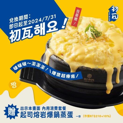 只要出示這個畫面,2024/7/31前到初瓦消費用餐,即贈人氣料理第一名的起司溶岩爆鍋蒸蛋一份,價值$210的溶岩蒸蛋上次我們沒點,但既然是人氣第一名的單點,想必不會太差