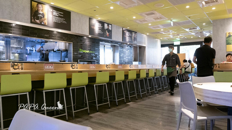 位於文心家樂福門市一樓的石二鍋用餐環境蠻大的,吧檯位子適合一個人吃飯,另有這種圓桌(人多)或是雙人座位區,呈現明亮的空間,廚房刻意採用透明櫥窗(非常整潔的廚房)