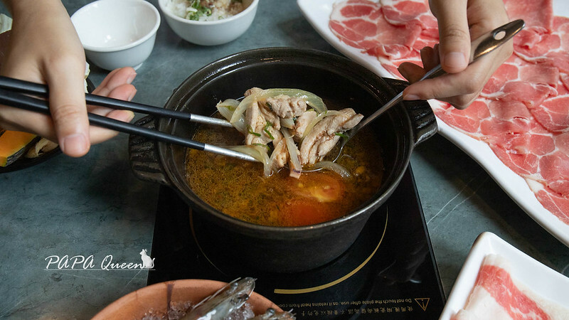 爆炒石頭鍋-湯頭喝了一口 Wow OH!! 根本就是石頭鍋遇上砂鍋魚頭湯底啊,湯底本身就有搭配雞肉透鍋石鍋炒香後,依然很嫩