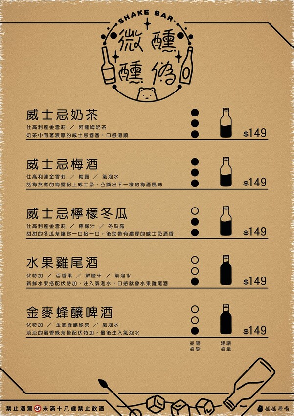 微醺飲品使用仕高利達『金雪莉』威士忌、伏特加調配飲品,共有威士忌奶茶、威士忌梅酒、威士忌檸檬冬瓜、水果雞尾酒和金麥蜂釀冰啤五種,每杯只要149元超划算的~