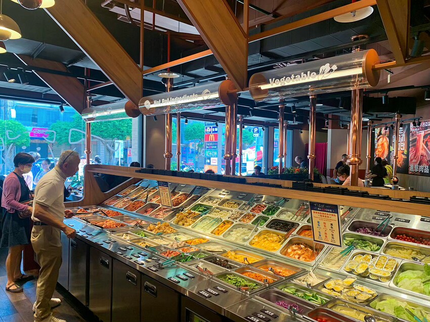 自助取餐區在餐廳中央,分別為肉品區、火鍋蔬菜與醃漬小菜區、韓式炸物、飲料冰淇淋等。夾菜旁有洗手台,提供取餐前後清洗,也有以不同顏色區分夾不同東西,蠻乾淨衛生方便。