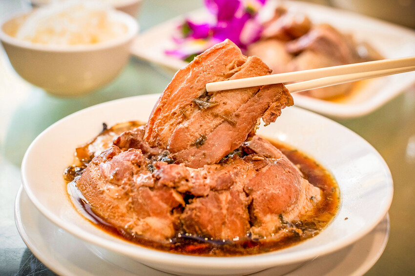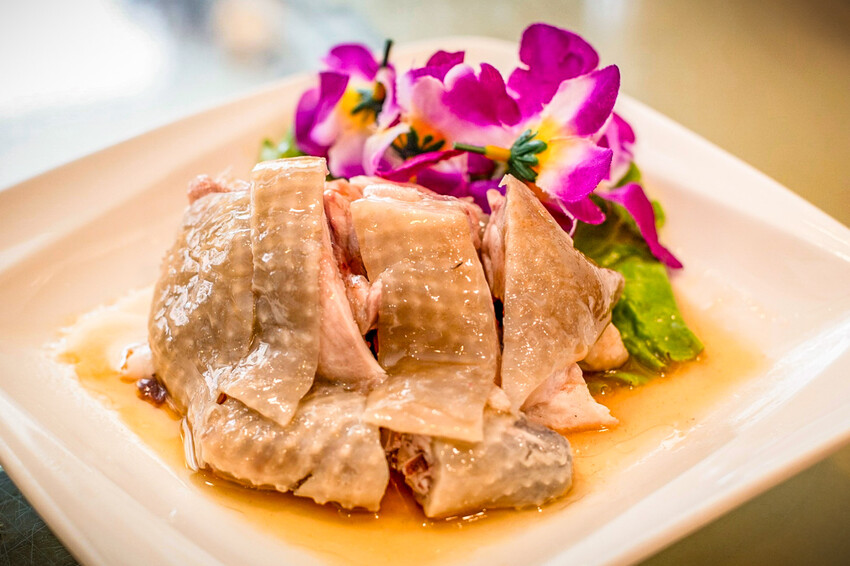 客家鹽焗雞,鹽焗雞使用的是質地既有彈性又柔嫩的雞,肉質非常有彈力,絕不會感覺過硬,雞皮不僅薄,皮下還帶有美味的肉凍,這些膠質在口中逐漸融化,釋放出雞肉的鮮美甜味!淡雅的鹹味不用沾醬也是非常好吃