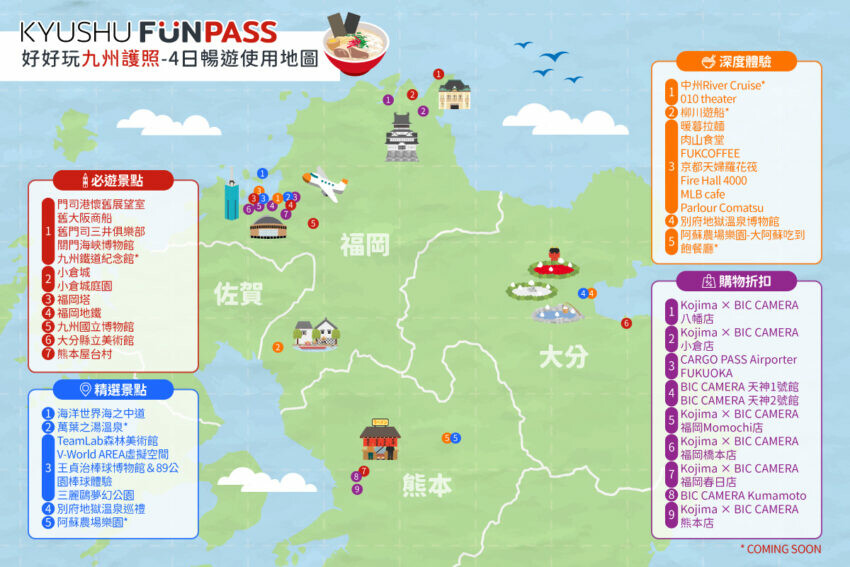 它是一張涵蓋北九州、福岡、熊本、大分等精選城市必玩景點,像是福岡塔、北九州門司港、北九州小倉城、熊本屋台村等,其中更包含福岡地鐵一日券(價值¥640)!不僅如此,九州FunPASS包含福岡必吃美食、超熱門的大分別府溫泉門票,還可以憑九州FunPASS APP享有Bic Camera、Kojima等購物折扣優惠,真是超值又划算的九州旅遊PASS!