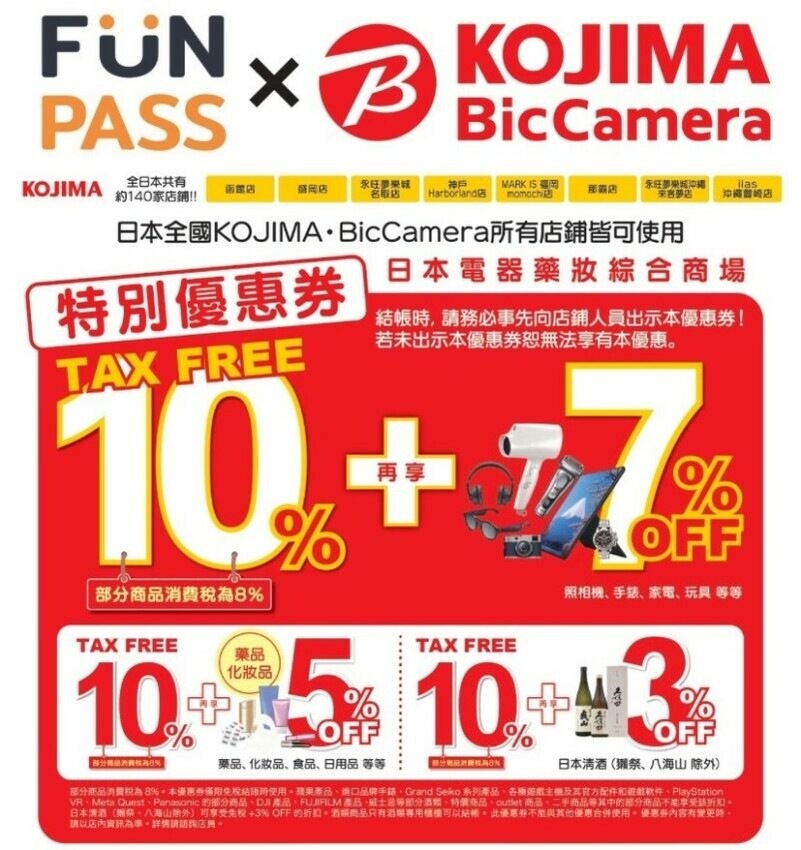 【福岡必逛推薦】Kojima (全九州免稅店鋪適用) 營業時間:10:00~21:00 各門市資訊:八幡店、小倉店、福岡Momochi店、 福岡橋本店、福岡春日店、熊本店九州FunPASS優惠:㊝家電消費金額達5,000日圓以上(含稅)可享17%的優惠(10%免税+7%OFF)㊝藥妝零食等消耗品,消費金額達5,000日圓以上(含稅)可享15%的優惠(10%免税+5%OFF)