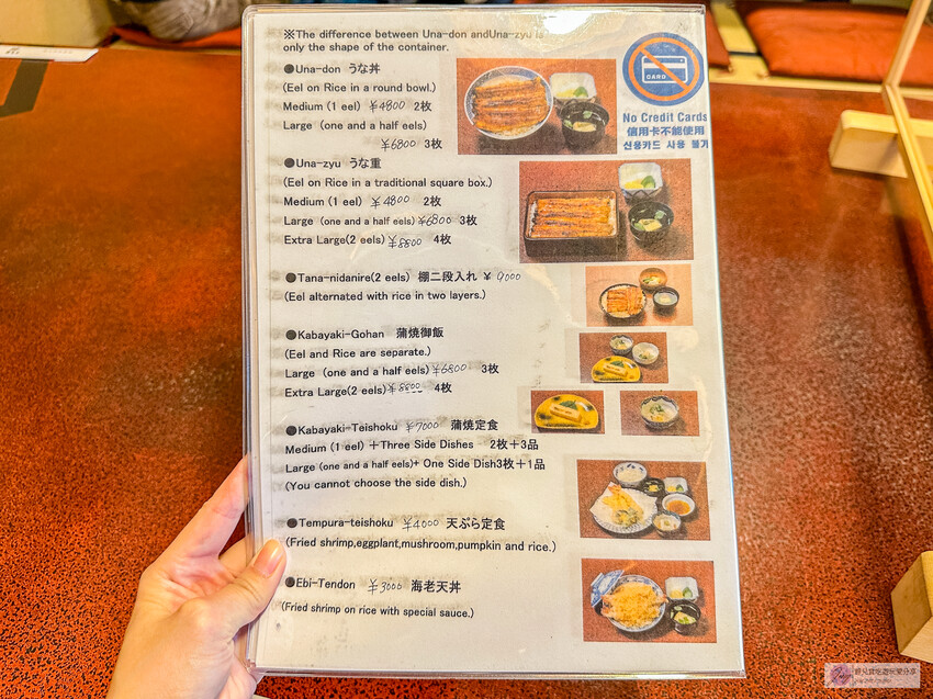 菜單有鰻魚飯、鰻魚重箱,鰻魚有分白燒跟蒲燒兩種口味,價位落在$4800~$8800,大概在$1000~$1800台幣左右,也有不少小菜可以選擇