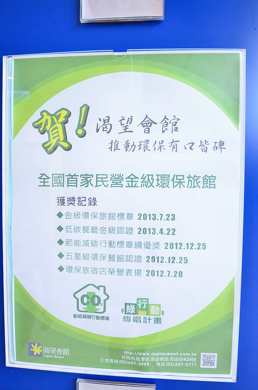 一旁的佈告欄上展示著得獎紀錄!"全國首家民營金級環保旅館"