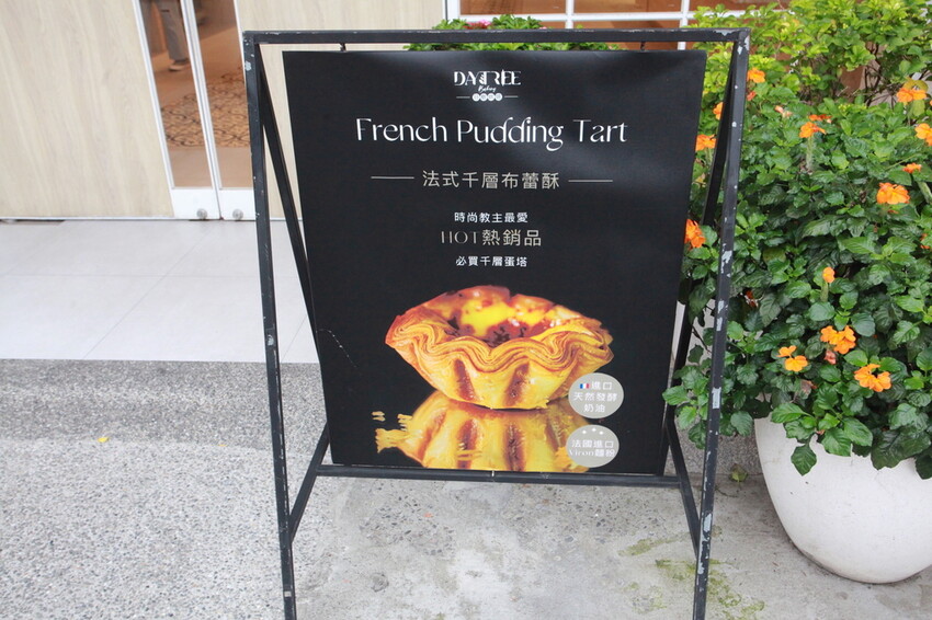 店門口放置立牌公告著法式千層布蕾酥。