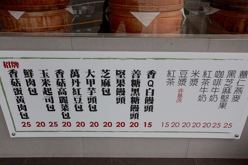 攤位前面掛著菜單供客人點餐參考,菜單有香菇蛋黃肉包25元、鮮肉包20元、白饅頭15元、玉米起司包25元、萬丹紅豆包20元、芝麻包20元......等等,包子種類很多可選擇定價親民,還有買十送ㄧ優惠。