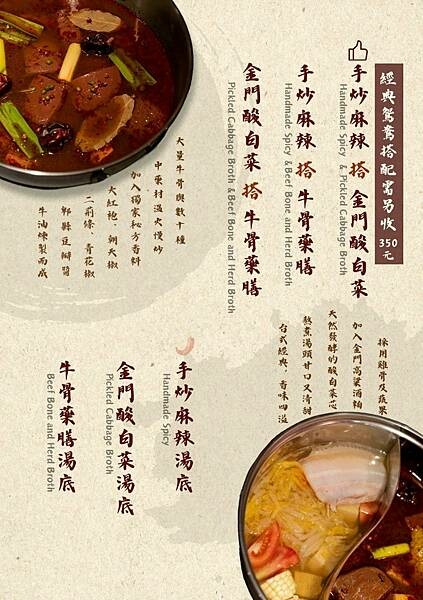 (手炒麻辣、金門酸白菜、牛骨藥膳)