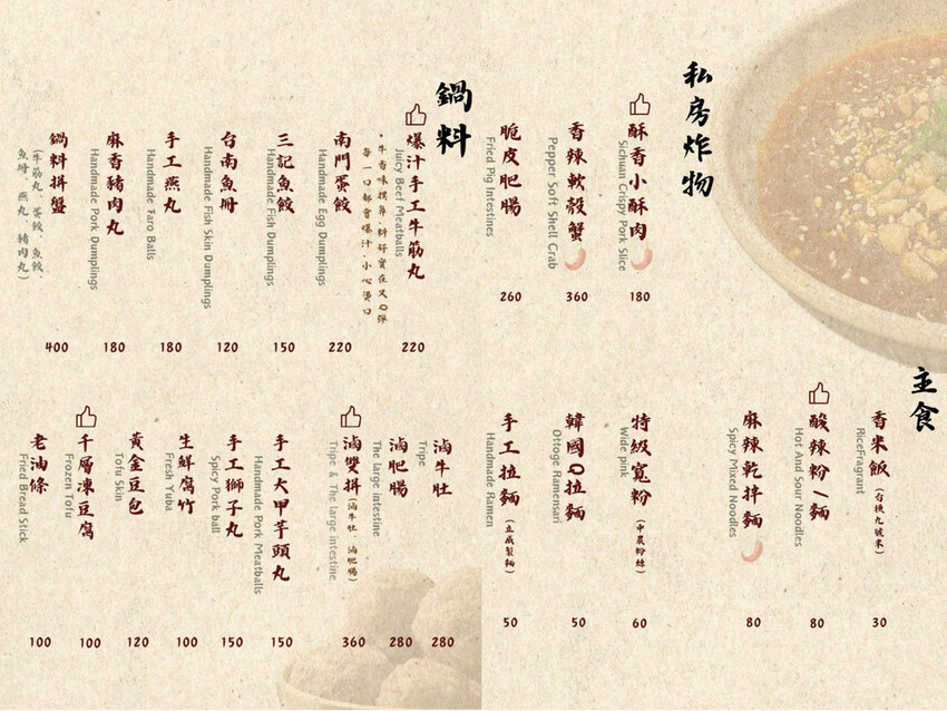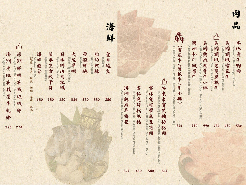 另可單點:肉品、海鮮、鍋料、鮮蔬、私房炸物、主食、飲品、酒類…等。