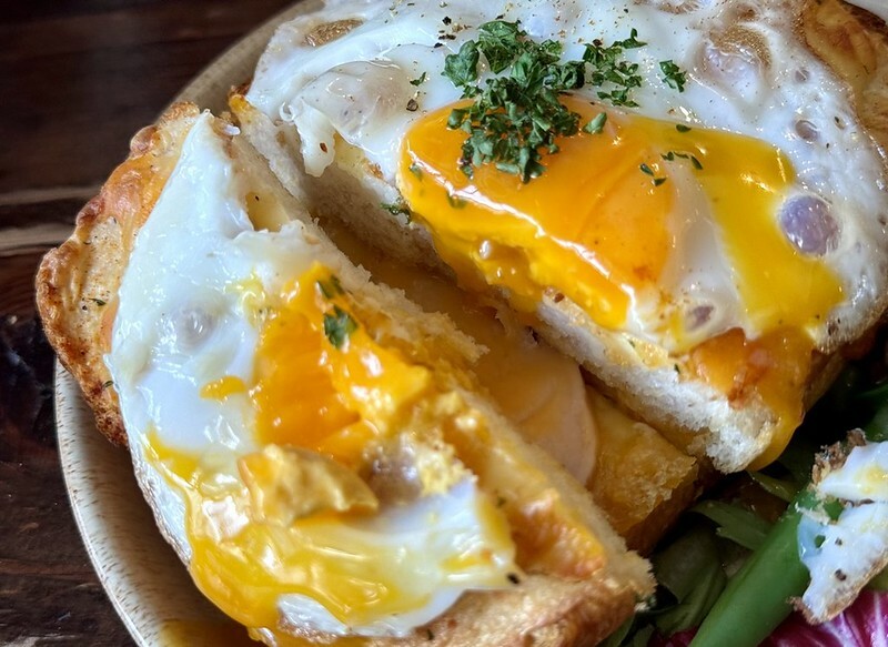 太陽蛋土司,烤厚片土司(加起司),上面舖著太陽蛋,附上生菜和以豆類製作的沙拉醬。