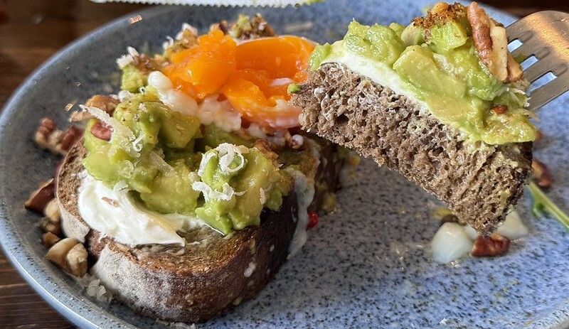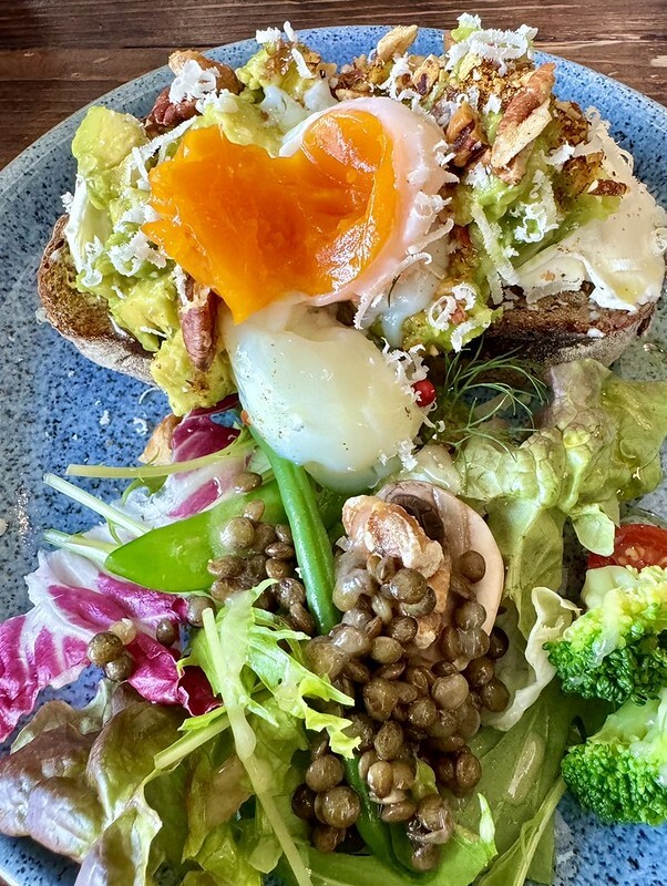 切開才發現黑麵包和酪梨間還有一層優格,混著半熟蛋層次分明,酥、脆、軟、綿、化接踵而來,加上灑了些在上面的堅果,真是好吃得亂七八糟!!!