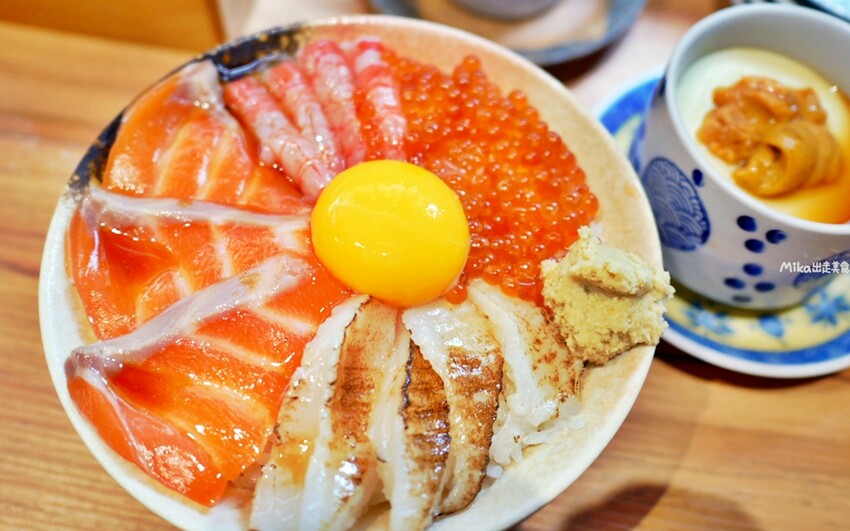 增添蛋黃的滑嫩口感,還有新鮮厚實的生魚片跟鮭魚卵。