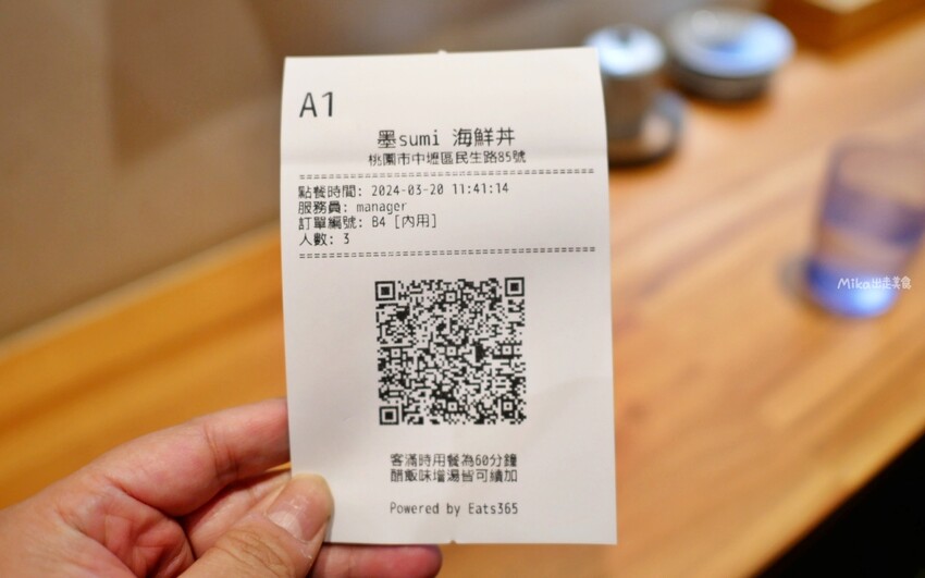 掃QR code 點餐,菜單有生食丼、熟食丼、生魚片、茶碗蒸、飲品等,丼飯價位落在$190~$680之間,以當日魚獲或當季食材為主,內容會有所調整。