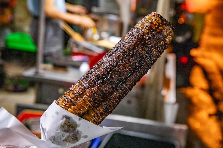 問阿伯能不能拍照紀念,阿伯很客氣說可以,讓我拍我選的烤玉米,態度真的很好又很客氣,阿伯烤玉米真的很細心,仔細地翻動刷醬,邊烤邊可以聞到濃郁的烤玉米香氣,光看這油亮亮焦香的外表就知道一定好吃啦!