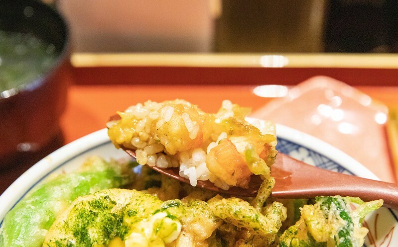 因為一碗點的是最厲害的海鮮丼,所以第二碗我們點了「弁天丼」1880日幣。這碗裡約莫有十來種炸過的魚(切得比較小塊),上面還有一顆天婦羅玉子,再灑上海苔粉增色也添味。