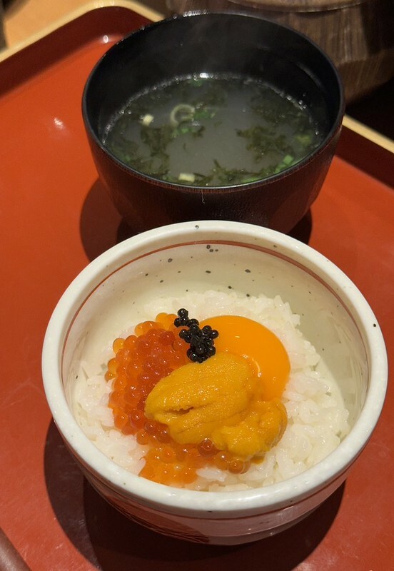 主廚從板前裡面又端了一小碗出來,然後指著桌上的立牌,給了我一個親切的微笑。哇里累,原來這一碗還有後著,一碗同樣加了海膽、鮭魚卵、魚子醬、生雞蛋的迷你丼,而且還有隱藏的吃法。