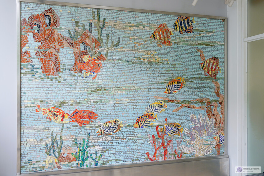 這個繽紛的熱帶魚馬賽克壁畫可是顏水龍唯一以海洋為題材的作品,於1973年鑲在電光牌衛浴設備公司的台北門市,重達600公斤、長320公分、寬233公分,是顏水龍70歲的作品,聽說價值兩千萬,整個壁畫真的猶如海洋流動的感覺,相當特別~