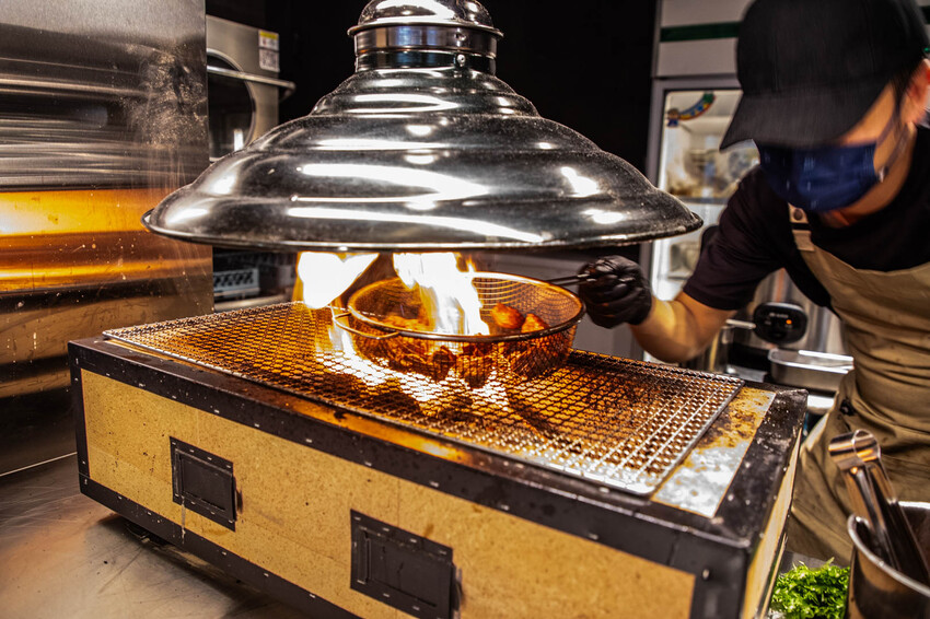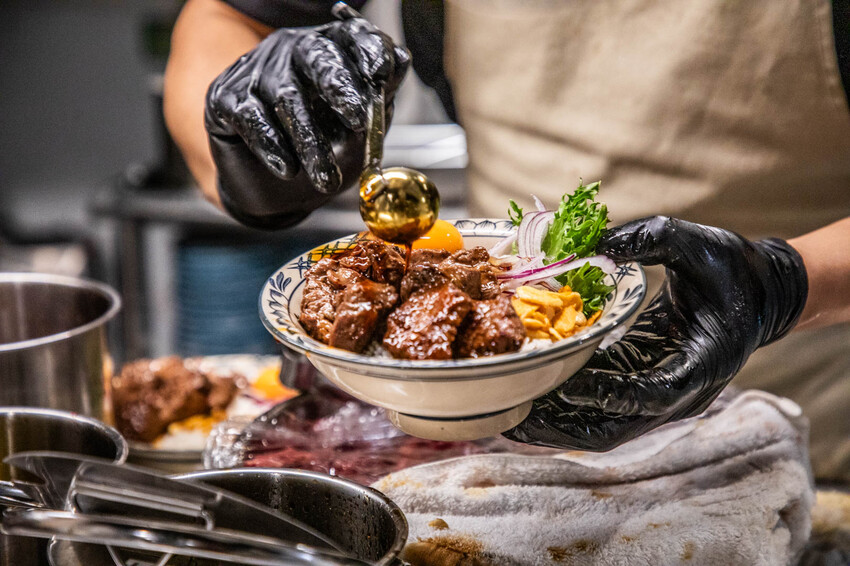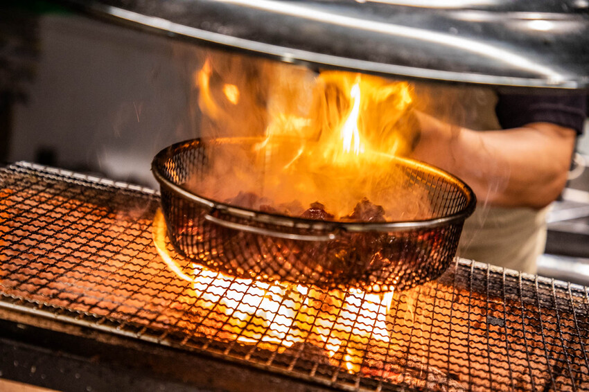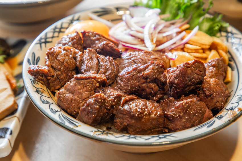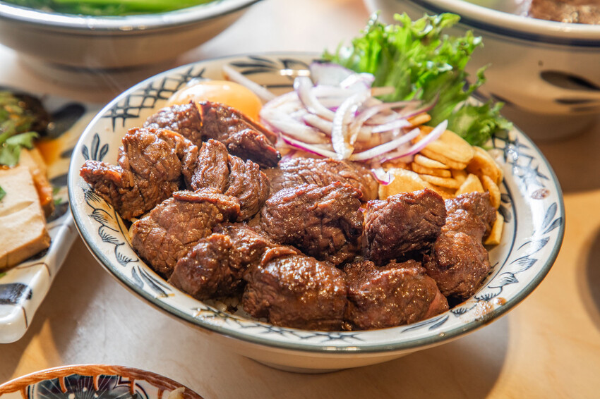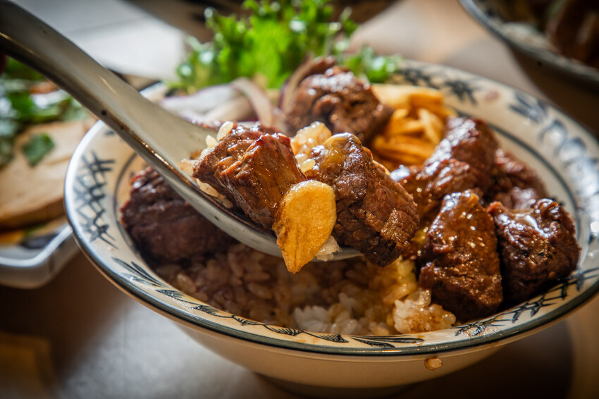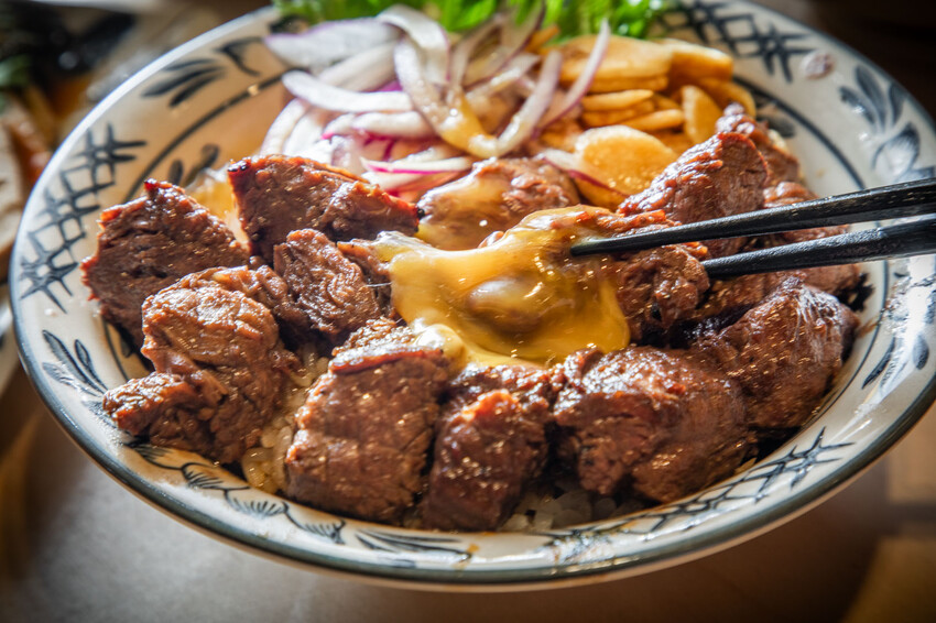 招牌燒肉飯也是現點現做,值得一提的是這裡的米飯可是用北海道產夢美人米唷!將大塊骰子牛放在鐵網上,用龍眼木燒烤,這樣烤出來的牛肉帶有炭火香,肉汁也能鎖在肉裡