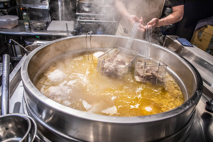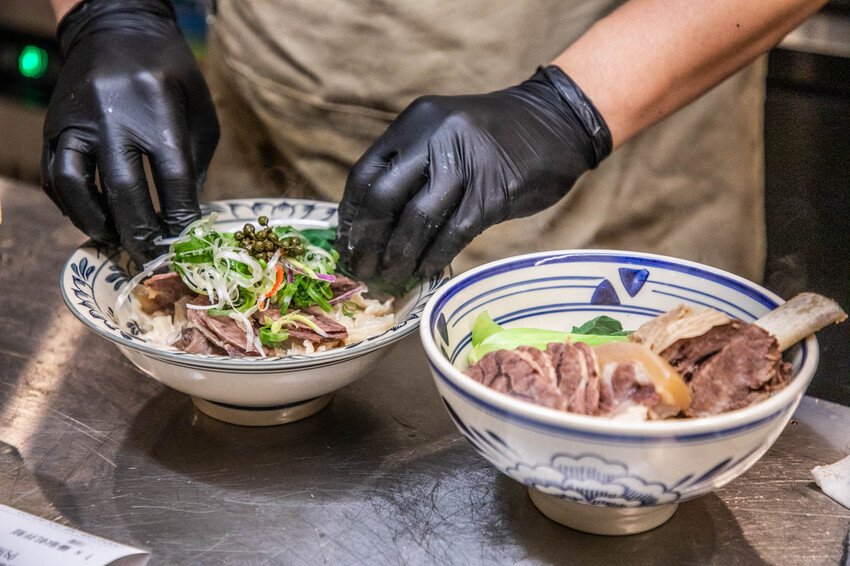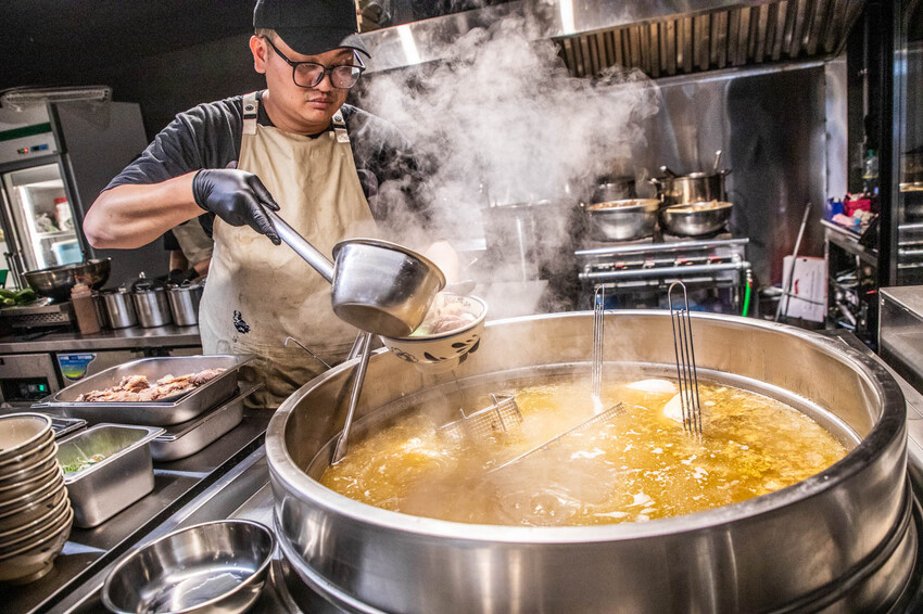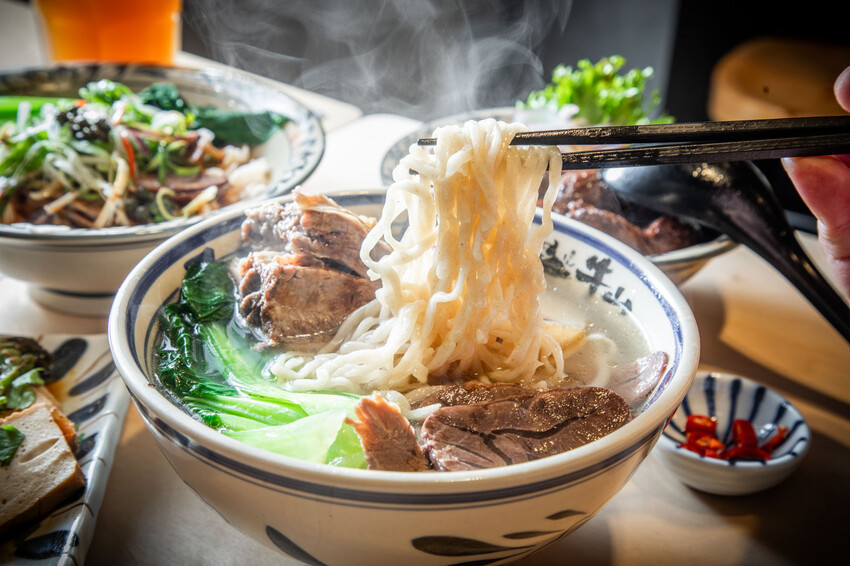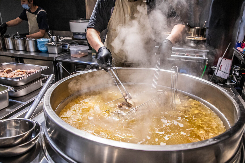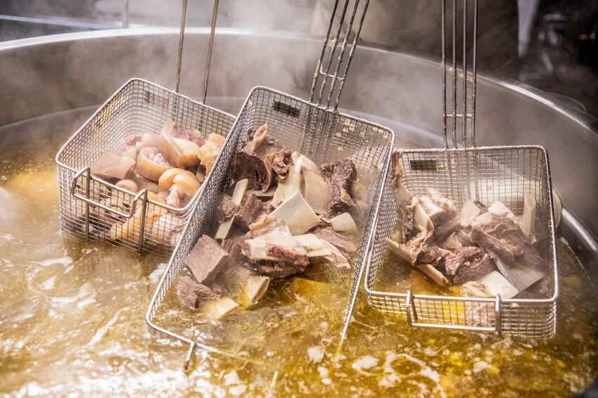 點好餐後,後場廚房就會開始製作,最特別的是牛山清燉牛肉麵是用超大鍋長時間清燉牛肉湯,將牛腱、牛肋、牛尾、牛雜等等食材通通放進去熬煮,站在旁邊都可以聞到濃郁的牛肉香氣!