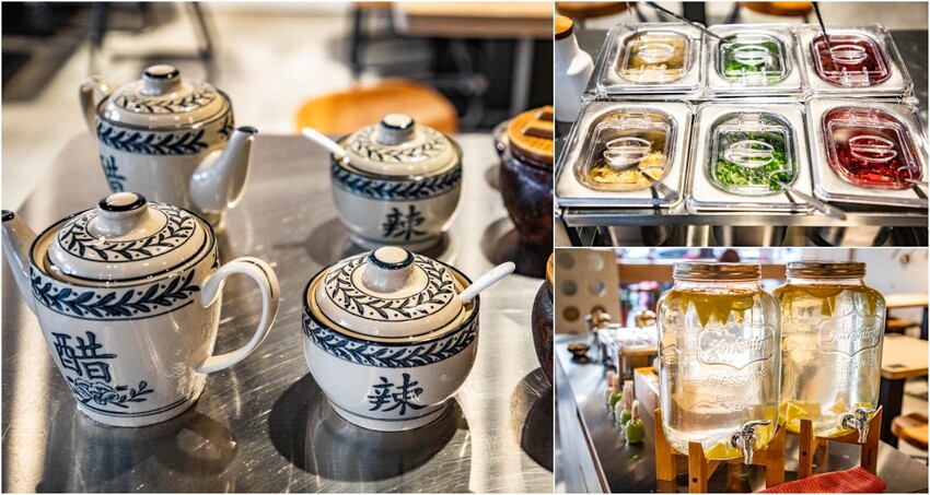 中央是自助區,有醬料(辣椒醬很辣請斟酌)、蔥蒜辣椒、餐具都是自取,旁邊也有檸檬水可以喝,牛山清燉牛肉麵用完餐也要自己收到餐盤回收區唷