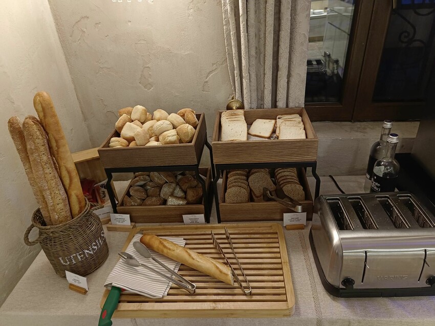 角落裡的麵包區,除了吐司多以供應歐式麵包為主,也有長棍麵包讓大家切,旁邊還有四槽式的烤麵包機