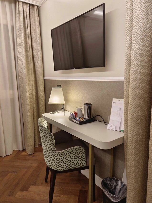 Hotel Continental房間的面積也不小,角落裡擺了張書桌,上面還有壁掛型電視,感覺它們連房間的椅子都有特別挑過