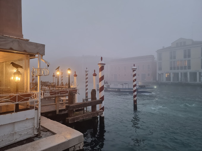 飯店旁的河道還籠罩在清晨的薄霧裡,倒是有幾隻鳥已經停在路燈上休息,有別於前一天的陽光普照,第二天的威尼斯突然變天,下起了毛毛雨🌧,也是我們在義大利10天唯一遇到下雨的一天